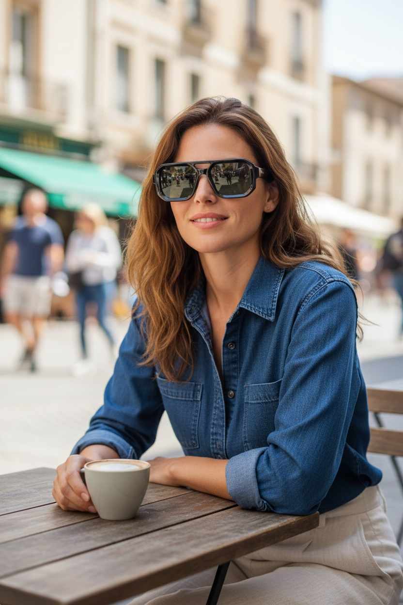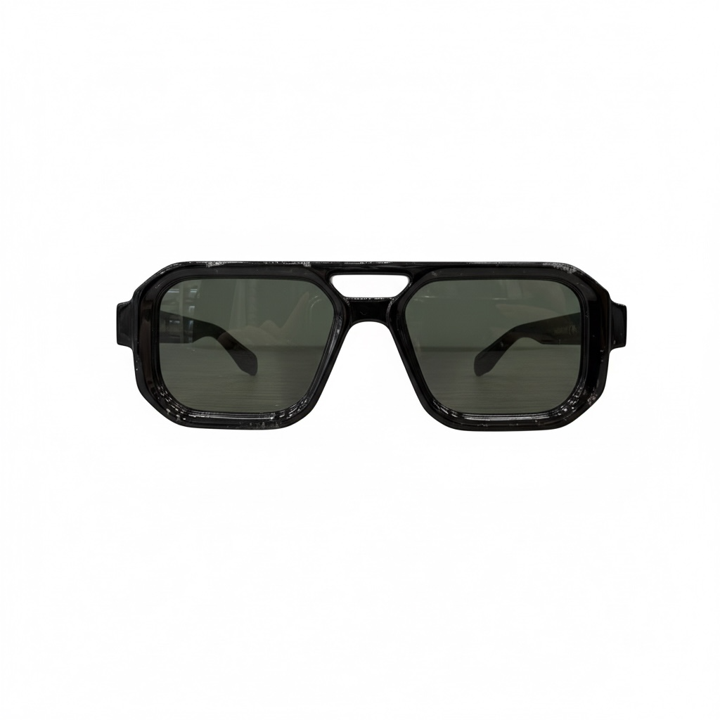Occhiali da sole con montatura nera spessa e design geometrico. Lenti scure e ponte doppio per uno stile deciso e contemporaneo.