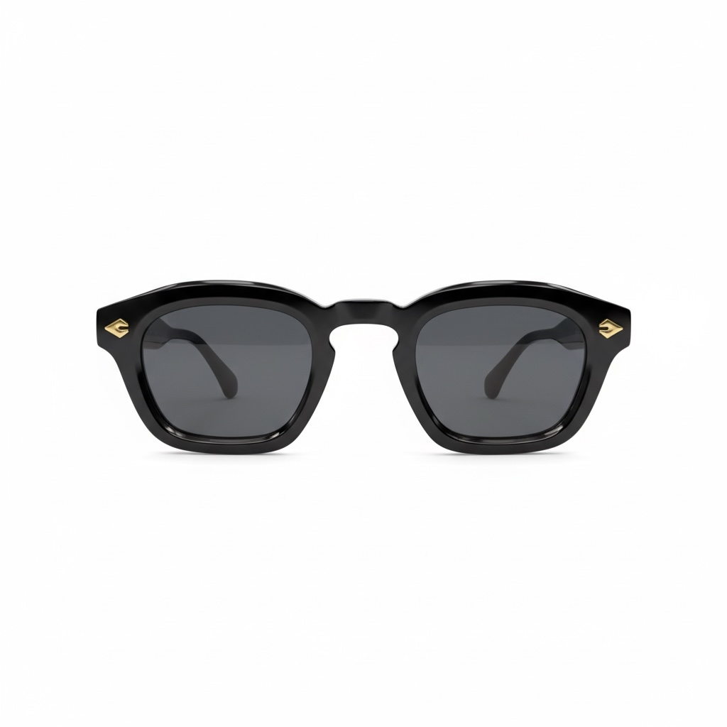 Occhiali da sole con montatura spessa nera e lenti scure. Design squadrato con dettagli laterali dorati per un look deciso e contemporaneo.