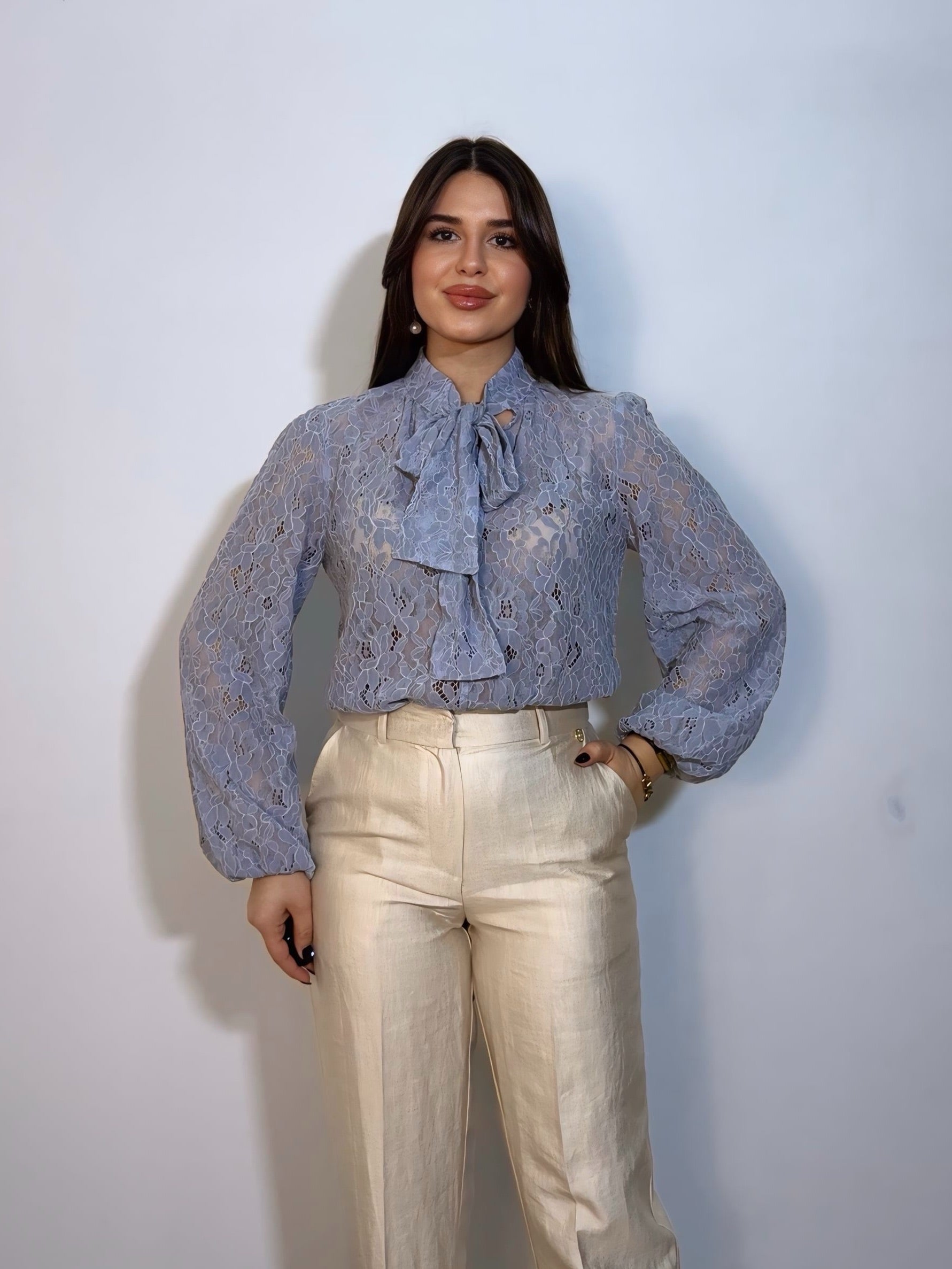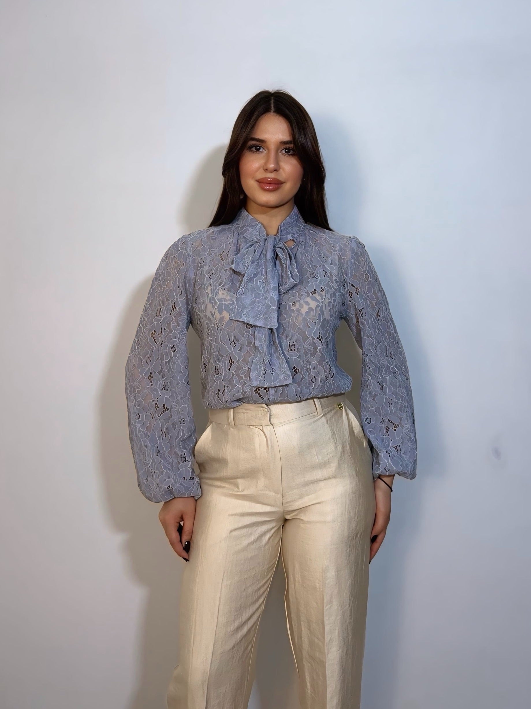 Camicia in pizzo con collo a fiocco e maniche lunghe, dal design elegante e femminile. Perfetta per creare look raffinati e sofisticati