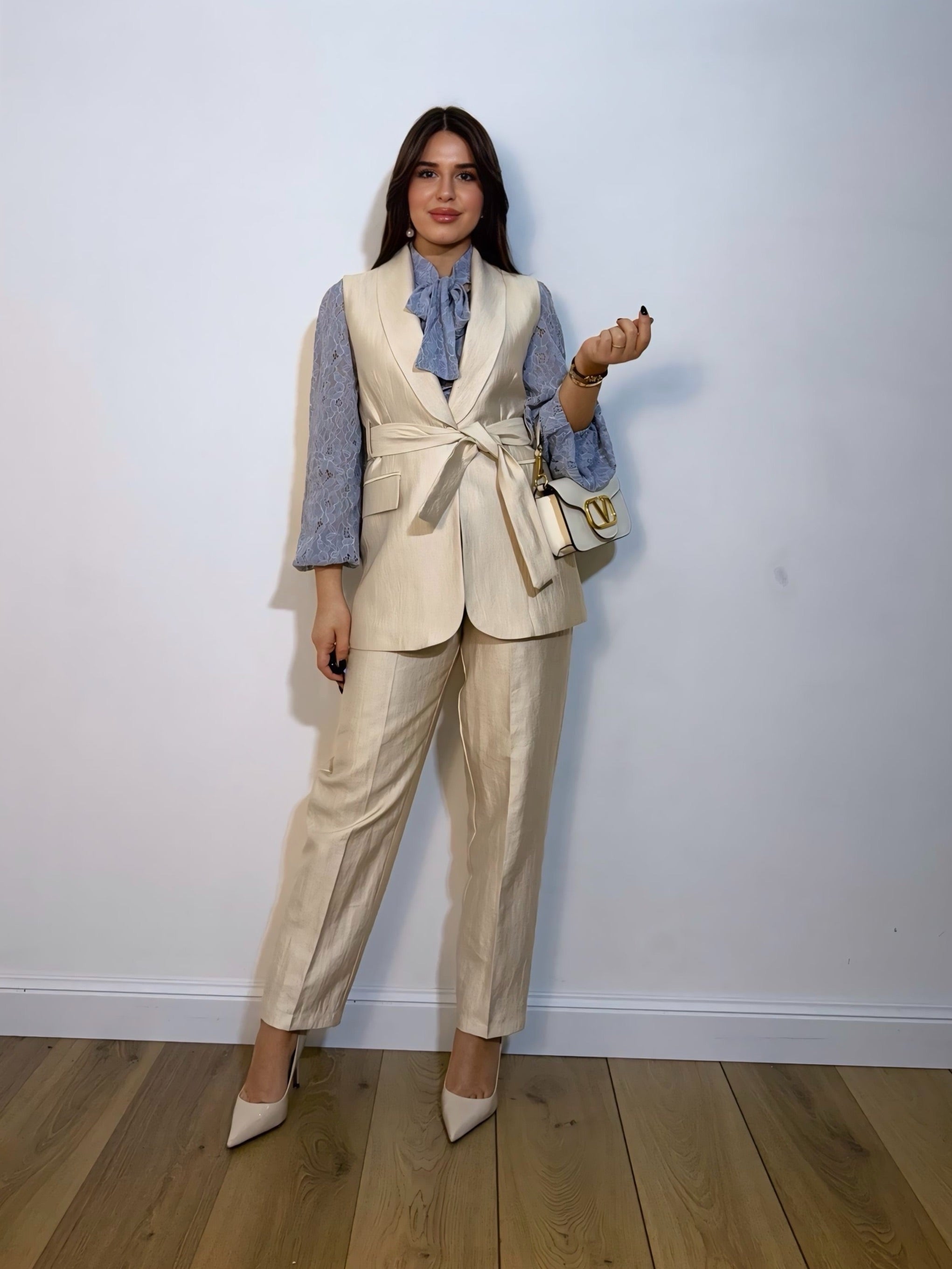 Gilet elegante dal taglio sartoriale con rever ampio e cintura in vita che valorizza la silhouette. Un capo raffinato e versatile, perfetto per completare look chic e sofisticati.